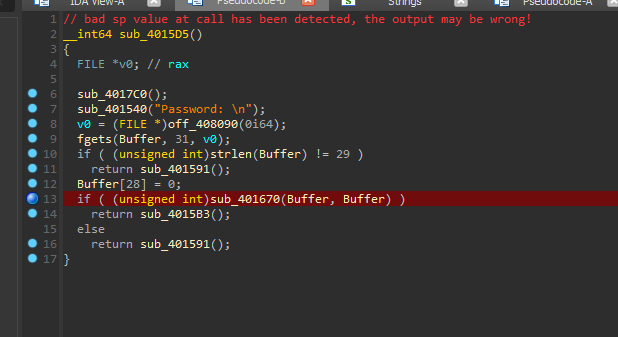 From here I can see that it expects a password. Following those functions sub_*