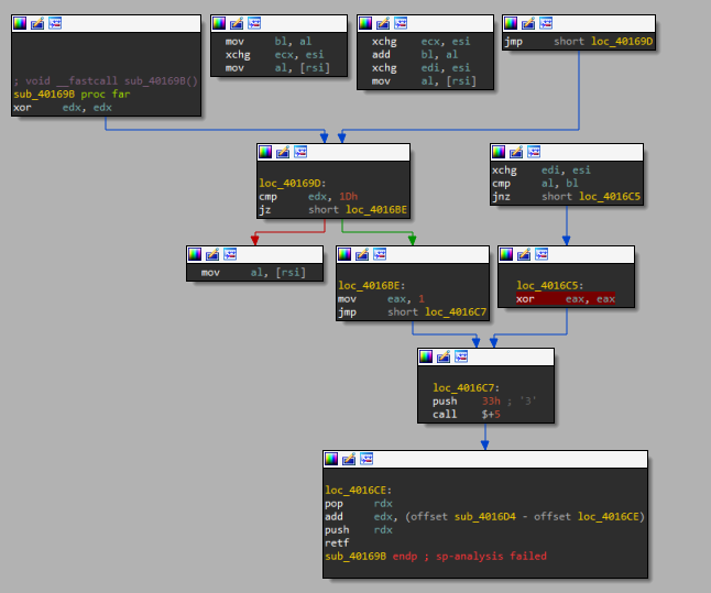 Having a breakpoint at loc_4016C5, I checked the values of al and bl based on the input of multiple b characters.